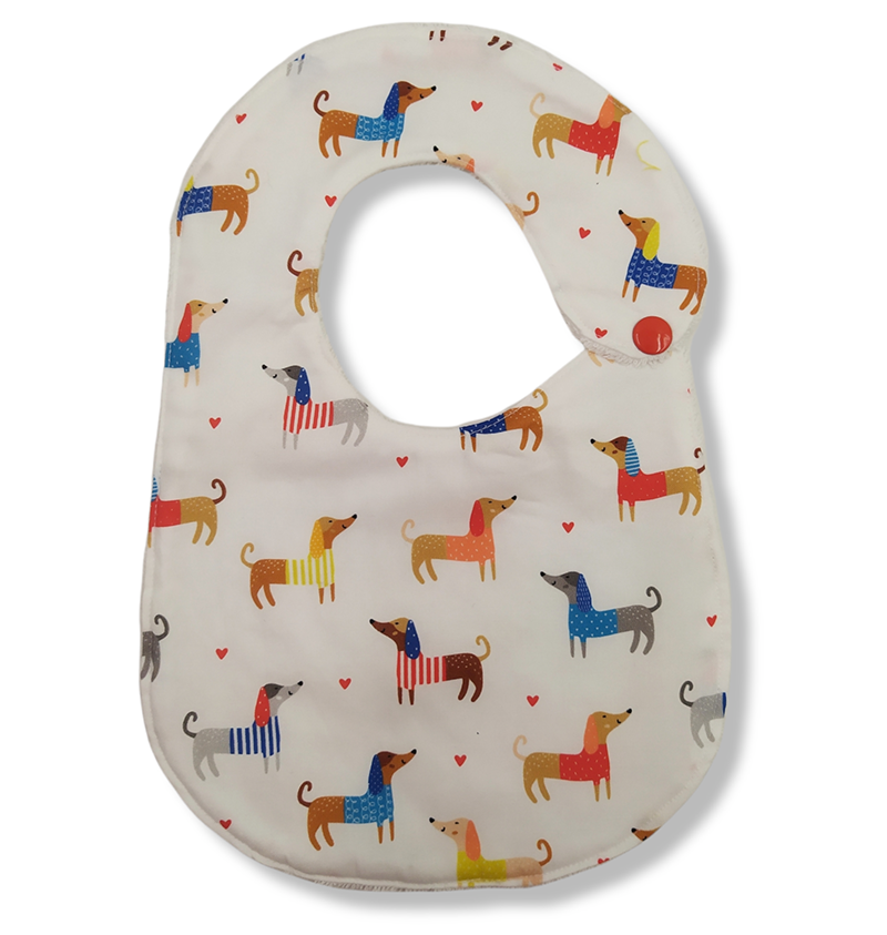 Bavaglino per bambino da 0 a 18 mesi, realizzato in tessuto americano stampato 100% cotone e spugna bianca 100% cotone. La composizione di cotone e spugna rende il bavaglino estremamente assorbente, perfetto per i lattanti, sarà molto utile in fase di svezzamento e di alimentazione autonoma; si lava facilmente in lavatrice. Chiusura con bottone a pressione. Dimensioni: altezza 30 cm, larghezza 21 cm, diametro collo 29 cm.