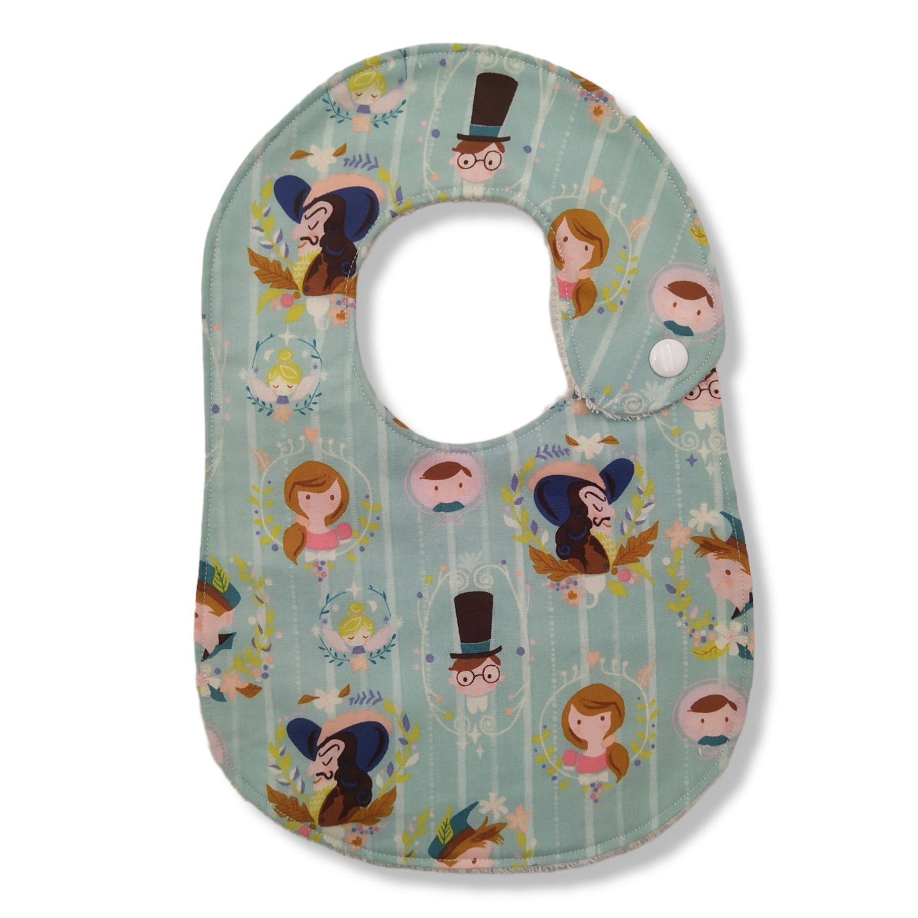 Bavaglino per bambino da 0 a 18 mesi, realizzato in tessuto americano stampato 100% cotone e spugna bianca 100% cotone. La composizione di cotone e spugna rende il bavaglino estremamente assorbente, perfetto per i lattanti, sarà molto utile in fase di svezzamento e di alimentazione autonoma; si lava facilmente in lavatrice. Chiusura con bottone a pressione. Dimensioni: altezza 30 cm, larghezza 21 cm, diametro collo 29 cm.
