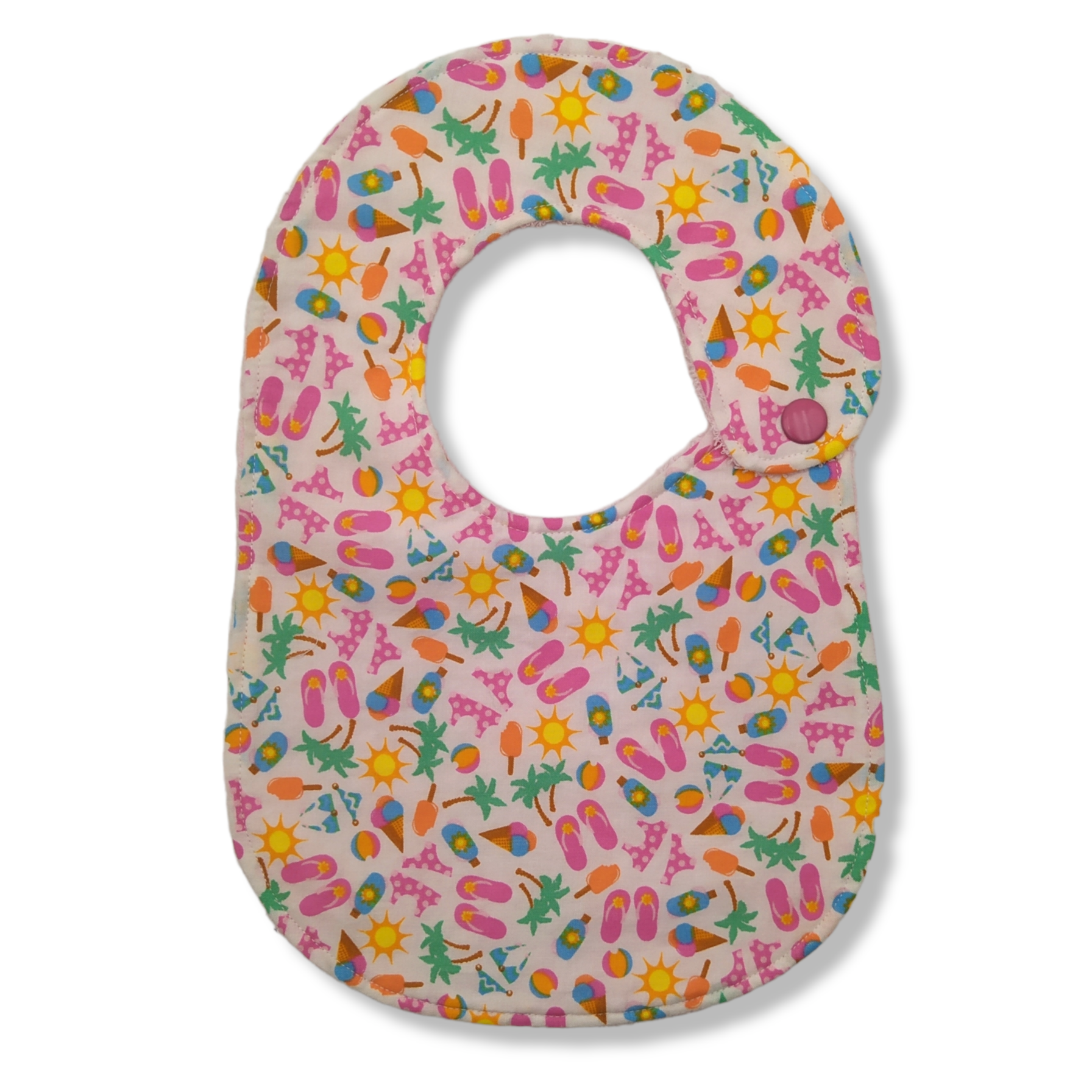 Bavaglino per bambino da 0 a 18 mesi, realizzato in tessuto americano stampato 100% cotone e spugna bianca 100% cotone. La composizione di cotone e spugna rende il bavaglino estremamente assorbente, perfetto per i lattanti, sarà molto utile in fase di svezzamento e di alimentazione autonoma; si lava facilmente in lavatrice. Chiusura con bottone a pressione. Dimensioni: altezza 30 cm, larghezza 21 cm, diametro collo 29 cm.