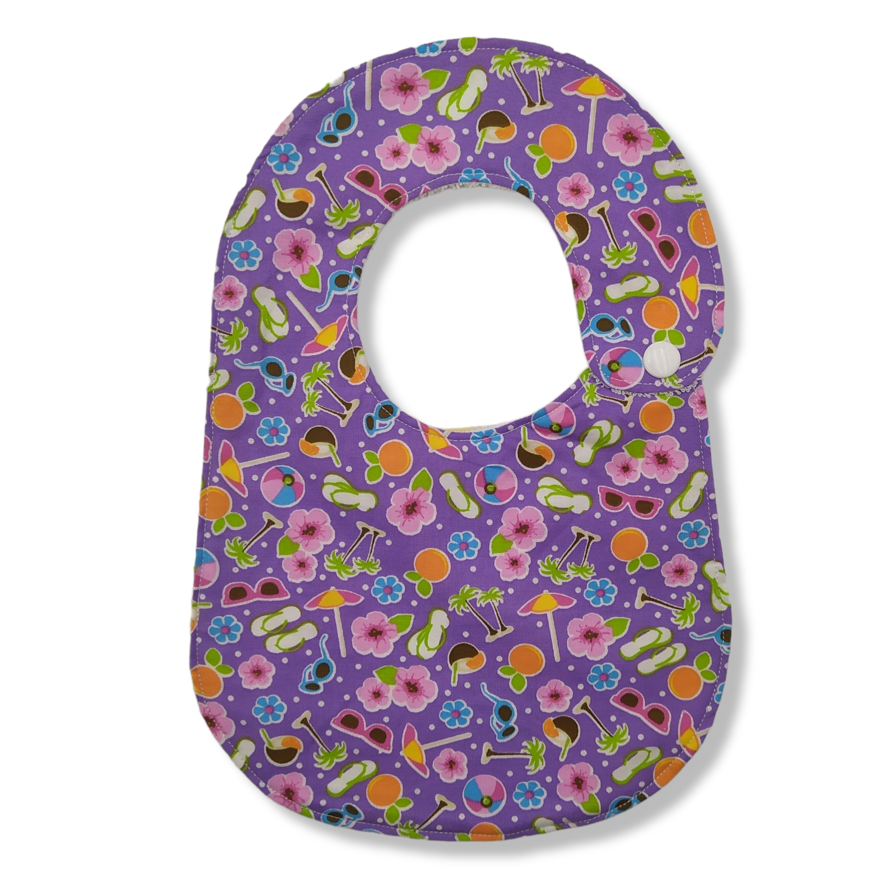 Bavaglino per bambino da 0 a 18 mesi, realizzato in tessuto americano stampato 100% cotone e spugna bianca 100% cotone. La composizione di cotone e spugna rende il bavaglino estremamente assorbente, perfetto per i lattanti, sarà molto utile in fase di svezzamento e di alimentazione autonoma; si lava facilmente in lavatrice. Chiusura con bottone a pressione. Dimensioni: altezza 30 cm, larghezza 21 cm, diametro collo 29 cm.