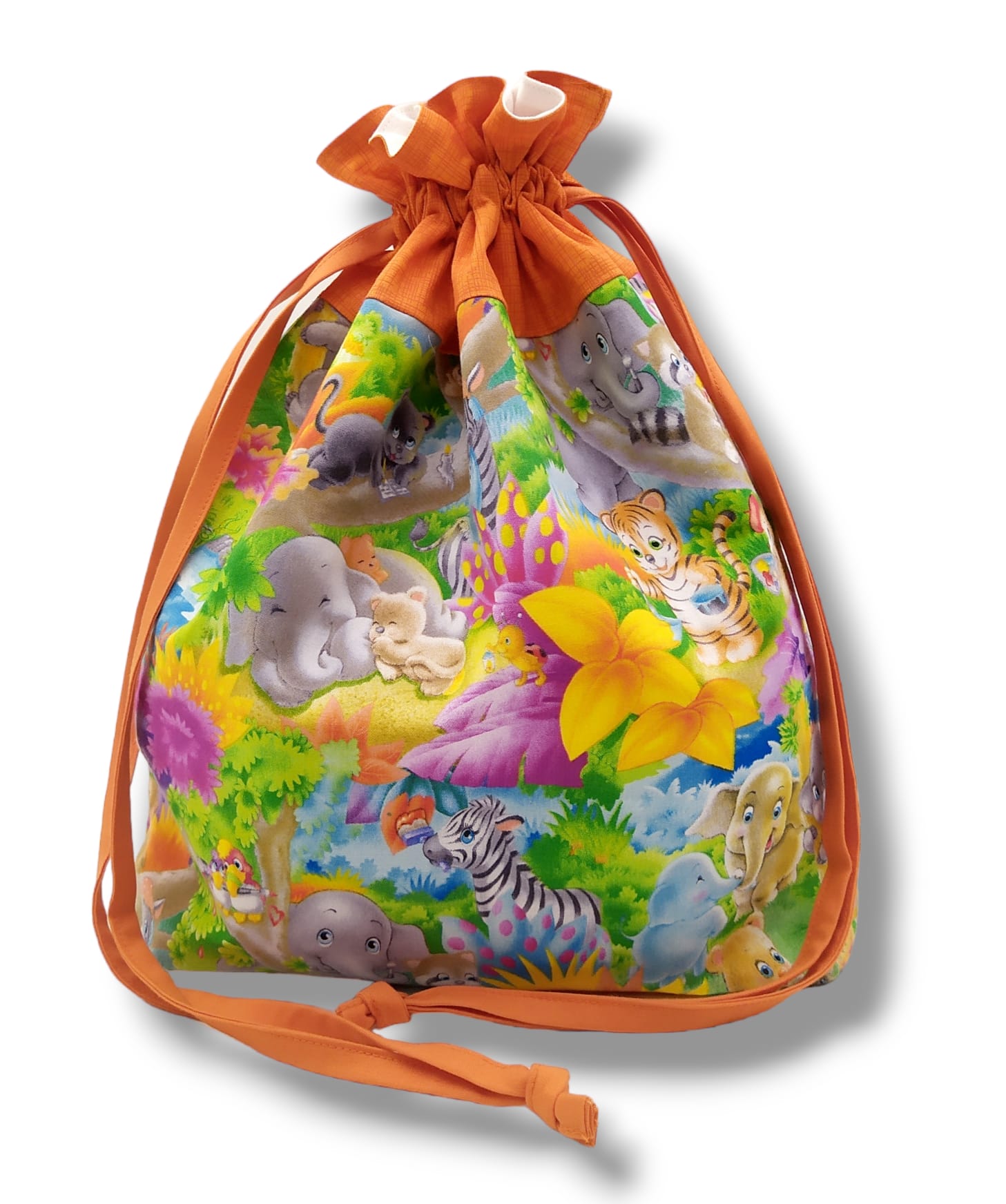 Sacchetto in tessuto americano stampato 100% cotone, foderato, dotato di due doppi lacci con cui si può stringerlo, chiuderlo e appenderlo. Utile per riporre nella borsa passeggino i cambi, potrà essere utilizzato all’asilo o nelle attività sportive. Dimensioni: altezza 37 cm, larghezza 33 cm, profondità 8 cm.