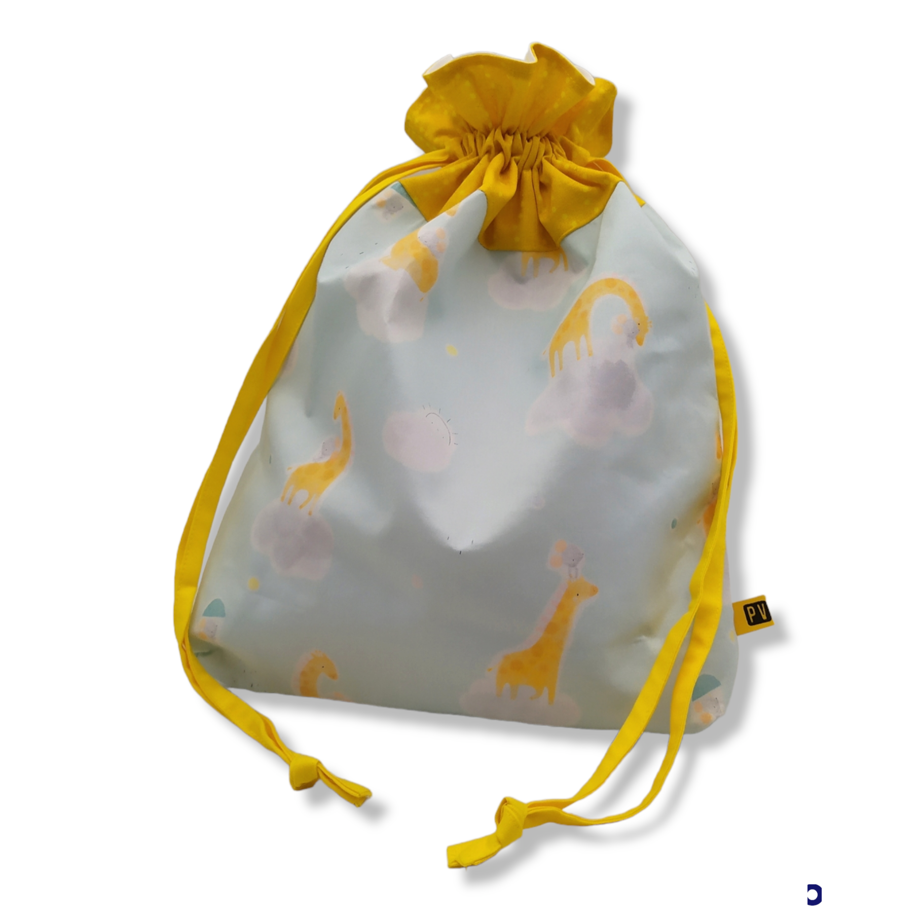 Sacchetto in tessuto americano stampato 100% cotone, foderato, dotato di due doppi lacci con cui si può stringerlo, chiuderlo e appenderlo. Utile per riporre nella borsa passeggino i cambi, potrà essere utilizzato all’asilo o nelle attività sportive. Dimensioni: altezza 37 cm, larghezza 33 cm, profondità 8 cm.