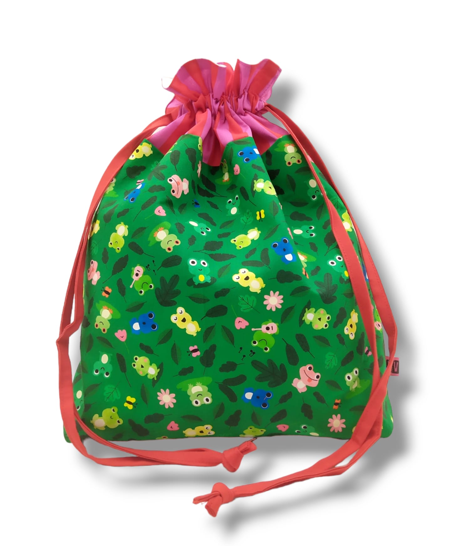 Sacchetto in tessuto americano stampato 100% cotone, foderato, dotato di due doppi lacci con cui si può stringerlo, chiuderlo e appenderlo. Utile per riporre nella borsa passeggino i cambi, potrà essere utilizzato all’asilo o nelle attività sportive. Dimensioni: altezza 37 cm, larghezza 33 cm, profondità 8 cm.