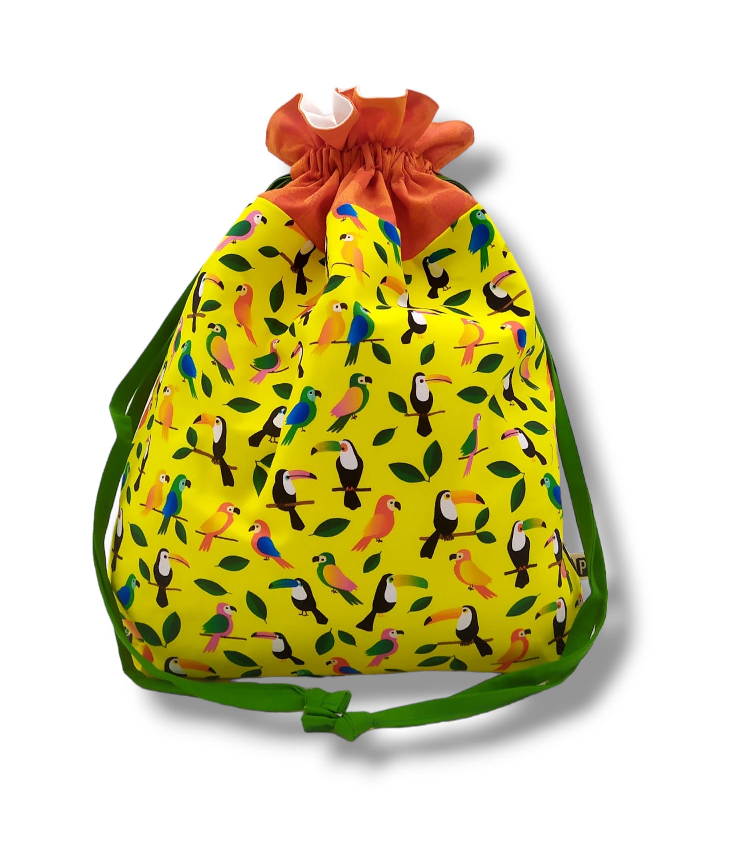 Sacchetto in tessuto americano stampato 100% cotone, foderato, dotato di due doppi lacci con cui si può stringerlo, chiuderlo e appenderlo. Utile per riporre nella borsa passeggino i cambi, potrà essere utilizzato all’asilo o nelle attività sportive. Dimensioni: altezza 37 cm, larghezza 33 cm, profondità 8 cm.